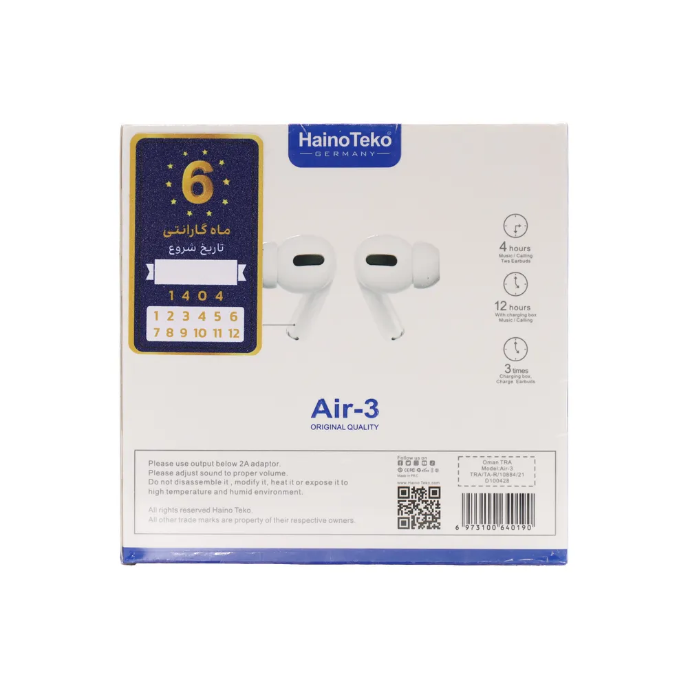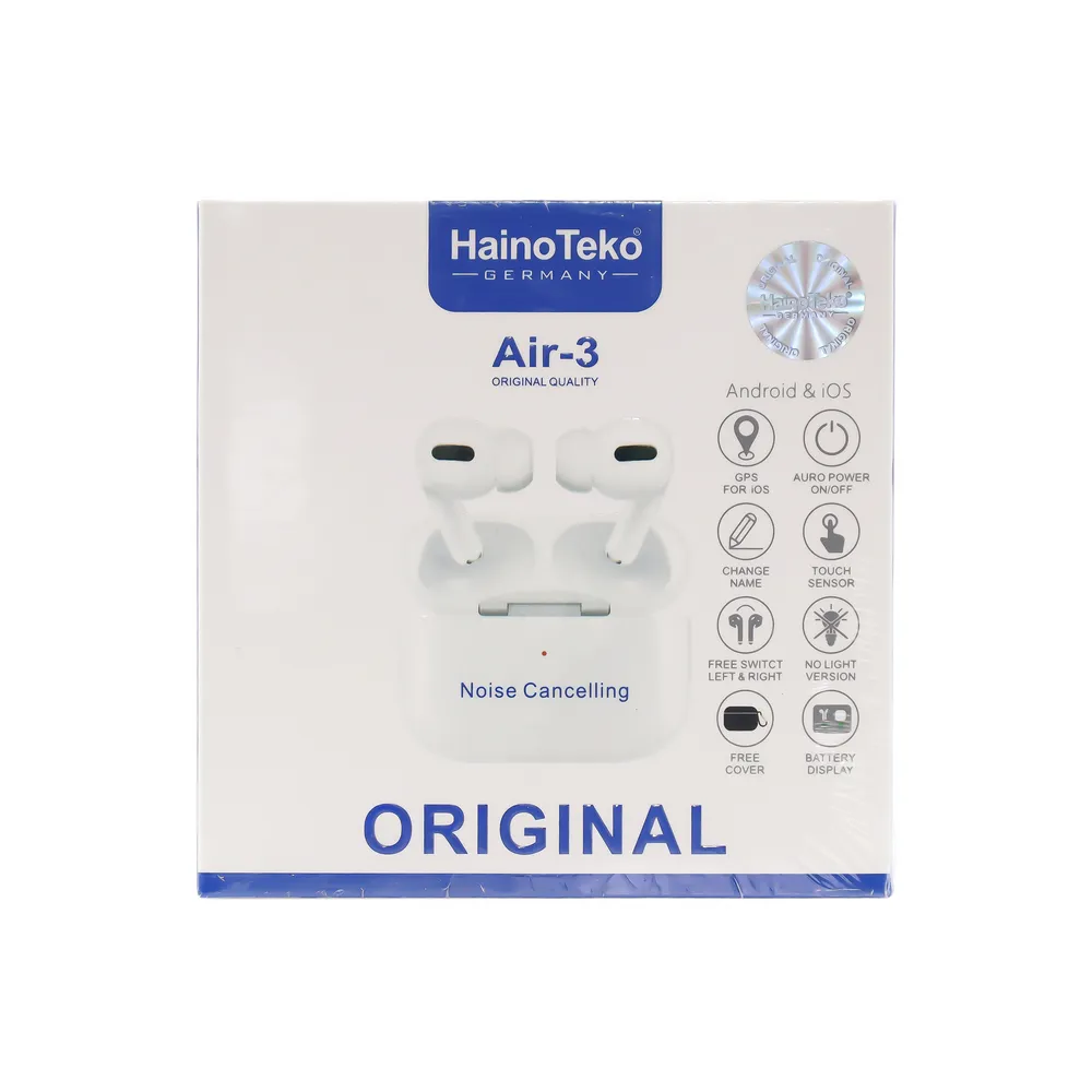 ایرپاد HAINO TEKO AIR-3 یکی از هندزفریهای بیسیم اقتصادی و خوشساخت بازار هست که با طراحی مشابه ایرپاد پرو اپل و امکانات قابلقبول، برای استفاده روزمره، مکالمه، و گوش دادن به موسیقی گزینهای مناسب محسوب میشه. در ادامه، مشخصات فنی، ظاهری و کاربردی این مدل رو با جزئیات بیشتر ارائه می دهیم.