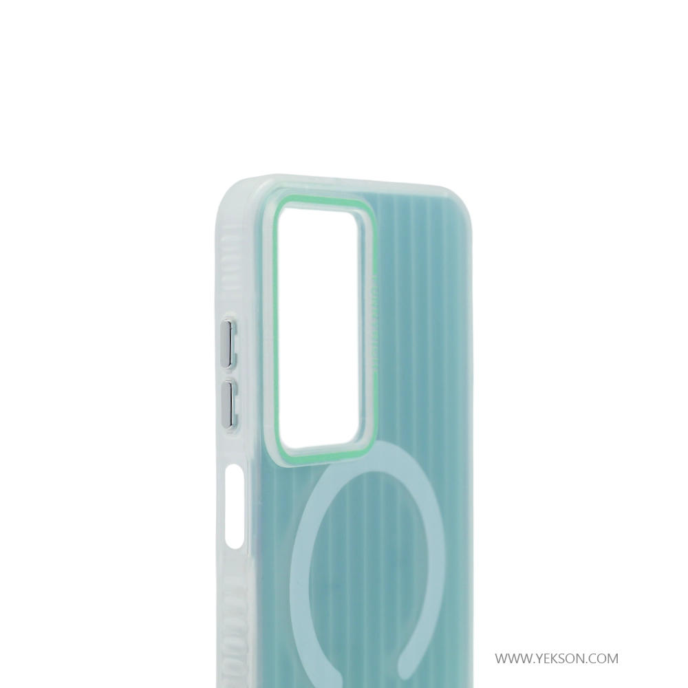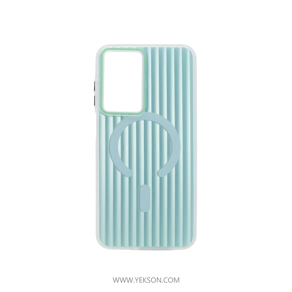 🎨 طراحی و بافت: پشت قاب دارای بافت کرکره‌ای شیاردار عمودی با طرح IMD است که علاوه بر ایجاد جلوه‌ی سه‌بعدی چشم‌نواز، به کاهش لغزش قاب در دست کمک می‌کند. دایره‌ی طرح مگ‌سیف نیز به زیبایی بصری قاب افزوده است.