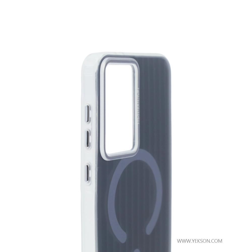 🎨 طراحی و بافت: پشت قاب دارای بافت کرکرهای شیاردار عمودی با طرح IMD است که علاوه بر ایجاد جلوهی سهبعدی چشمنواز، به کاهش لغزش قاب در دست کمک میکند. دایرهی طرح مگسیف نیز به زیبایی بصری قاب افزوده است.
